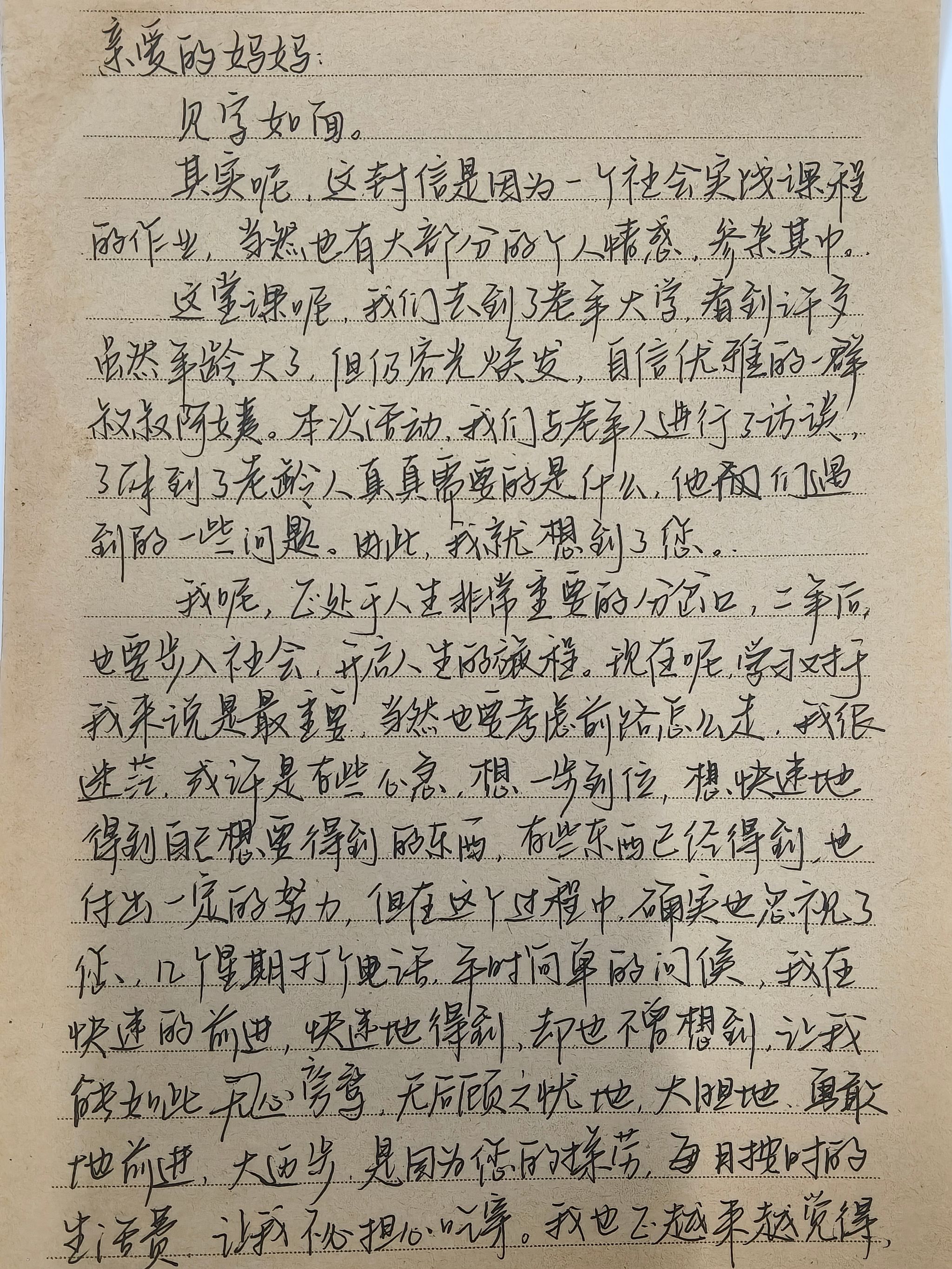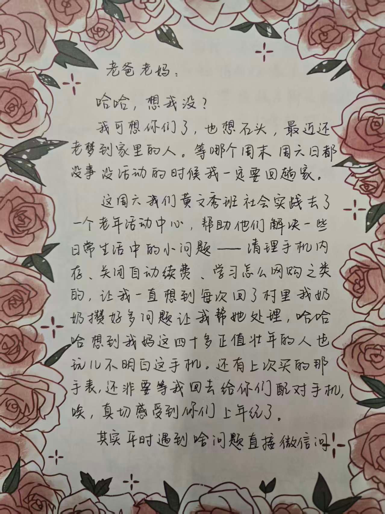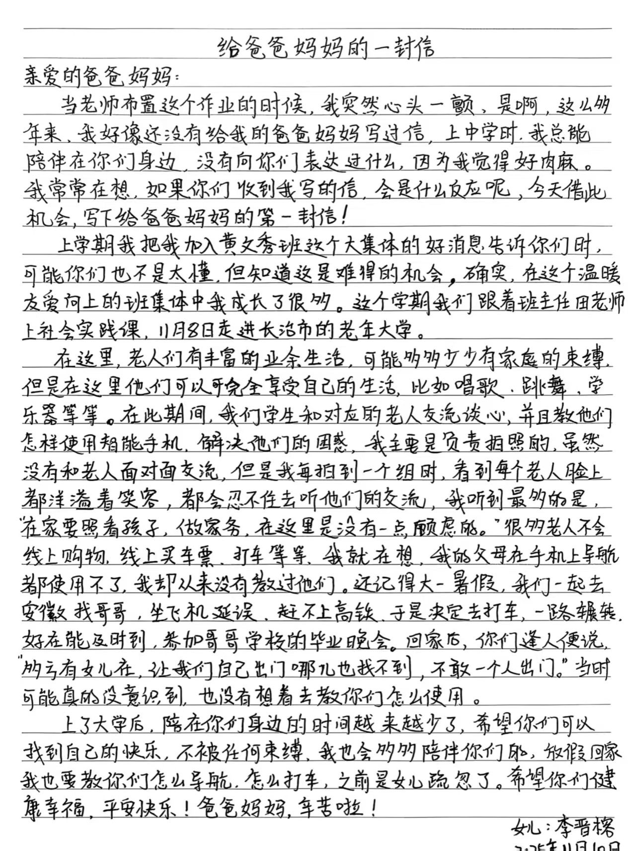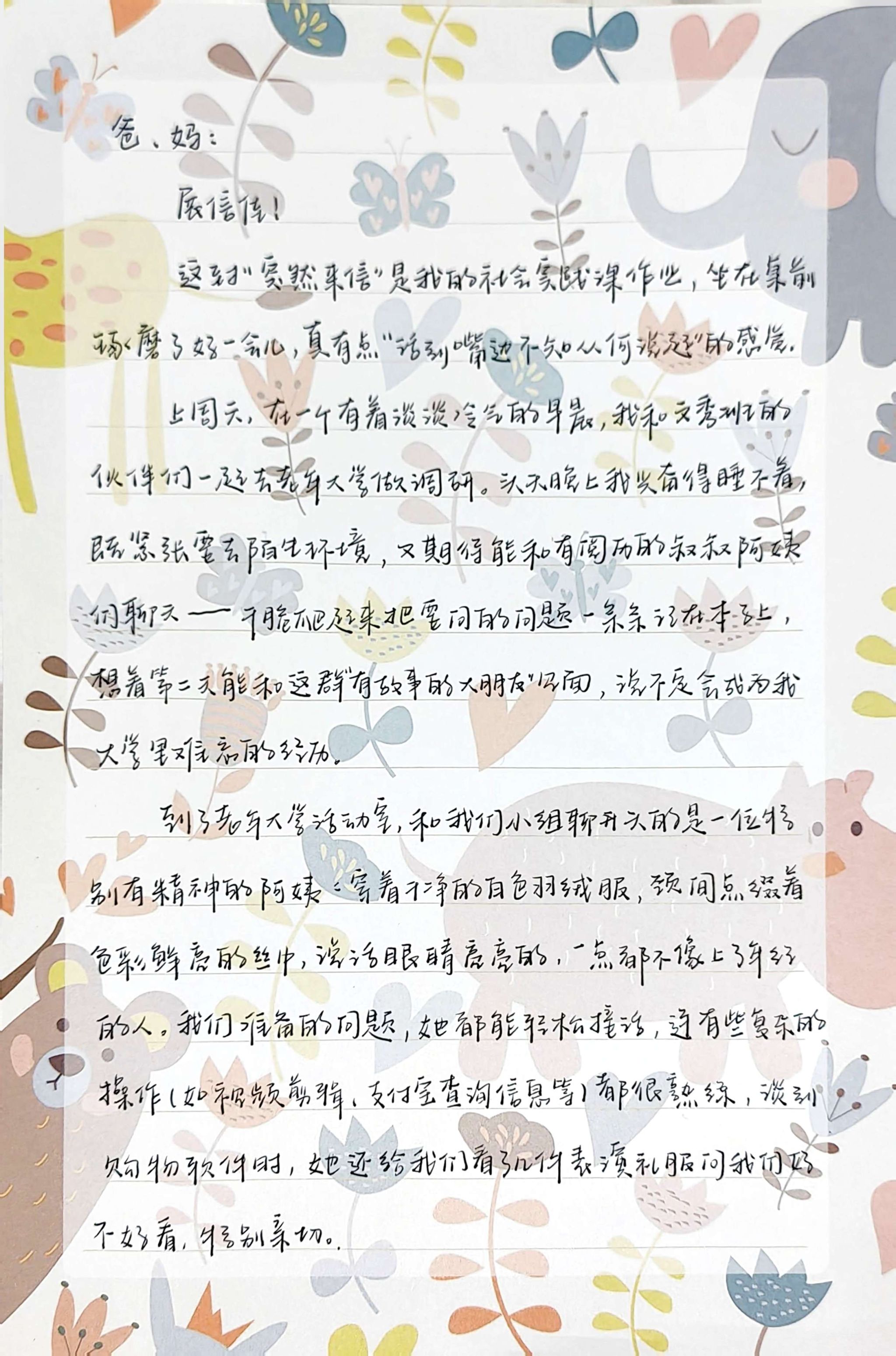 短短一个半小时,对老人而言,收获的是被倾听的温暖和解决难题的安心;对学生来说,得到的是与长辈交流的感动,以及用所学帮助他人的成就感。这份双向的温暖,成了课堂最珍贵的收尾。“给父母的一封信”是此次社会实践课的课后作业,学子们将课堂中从老人身上体会到的父母之心,化作纸上的涓涓细流。这封家书,是“文心秀行”社会实践课的“应有之义”。