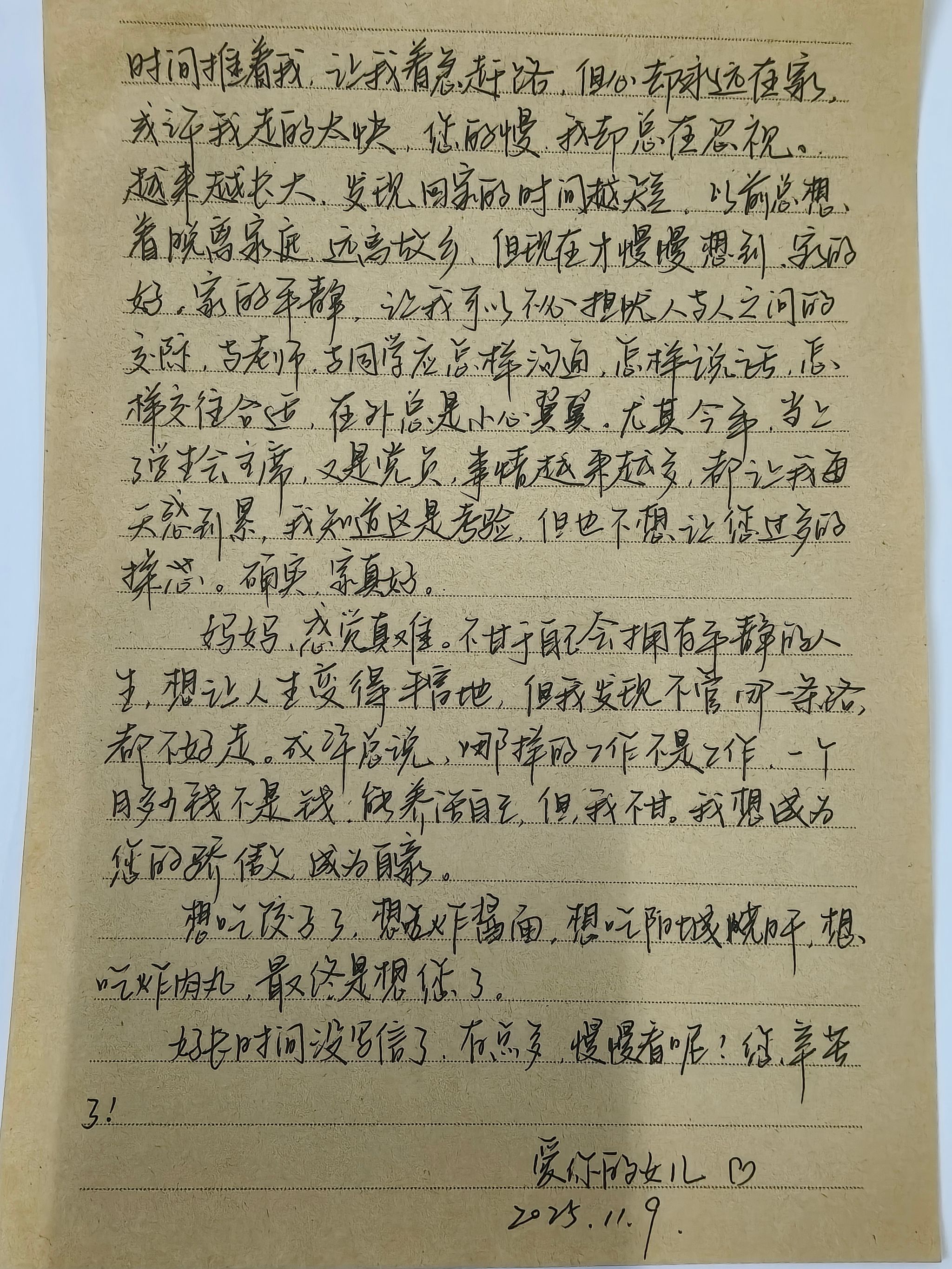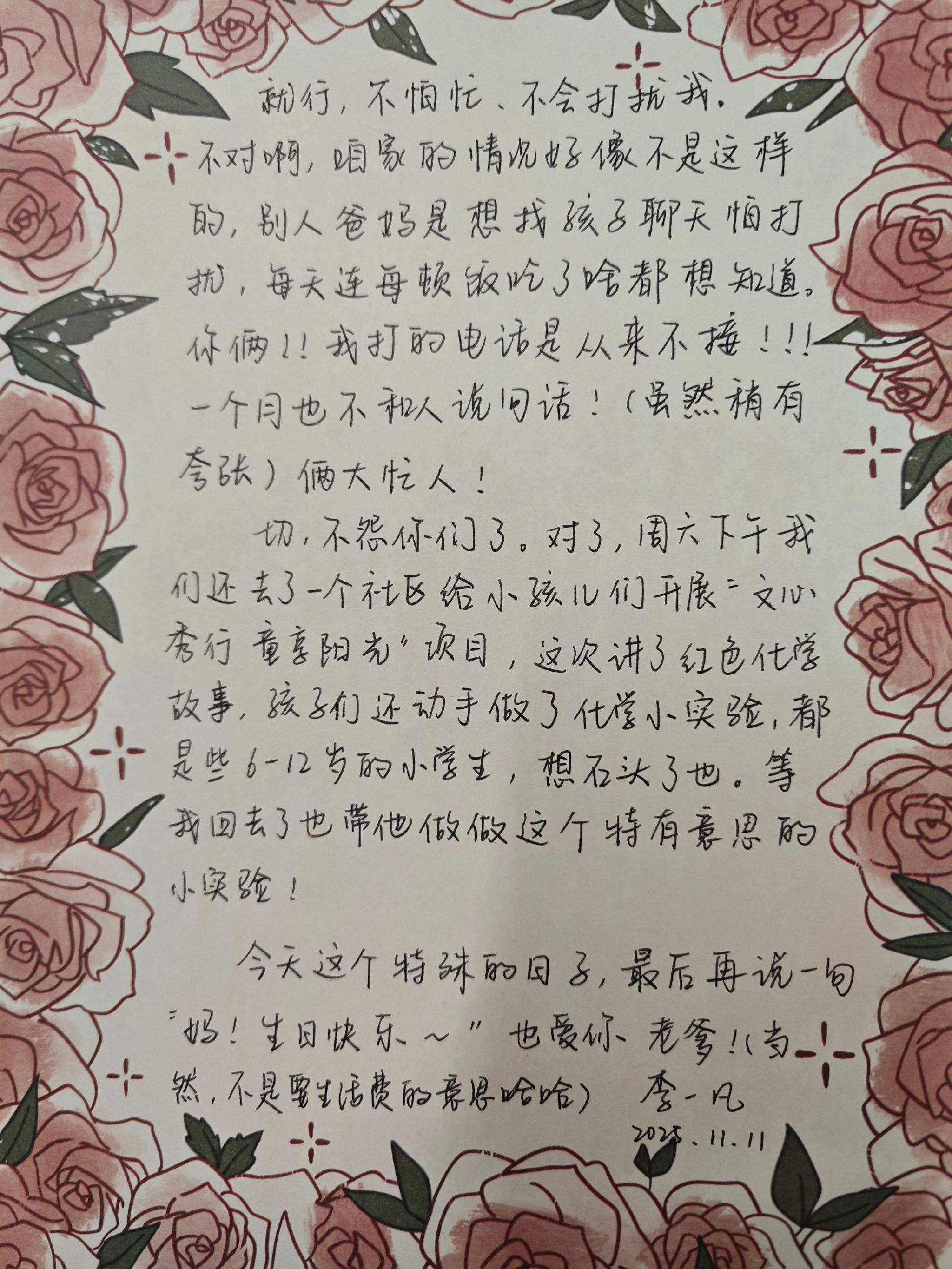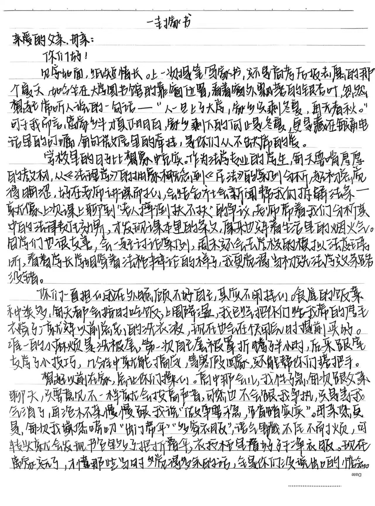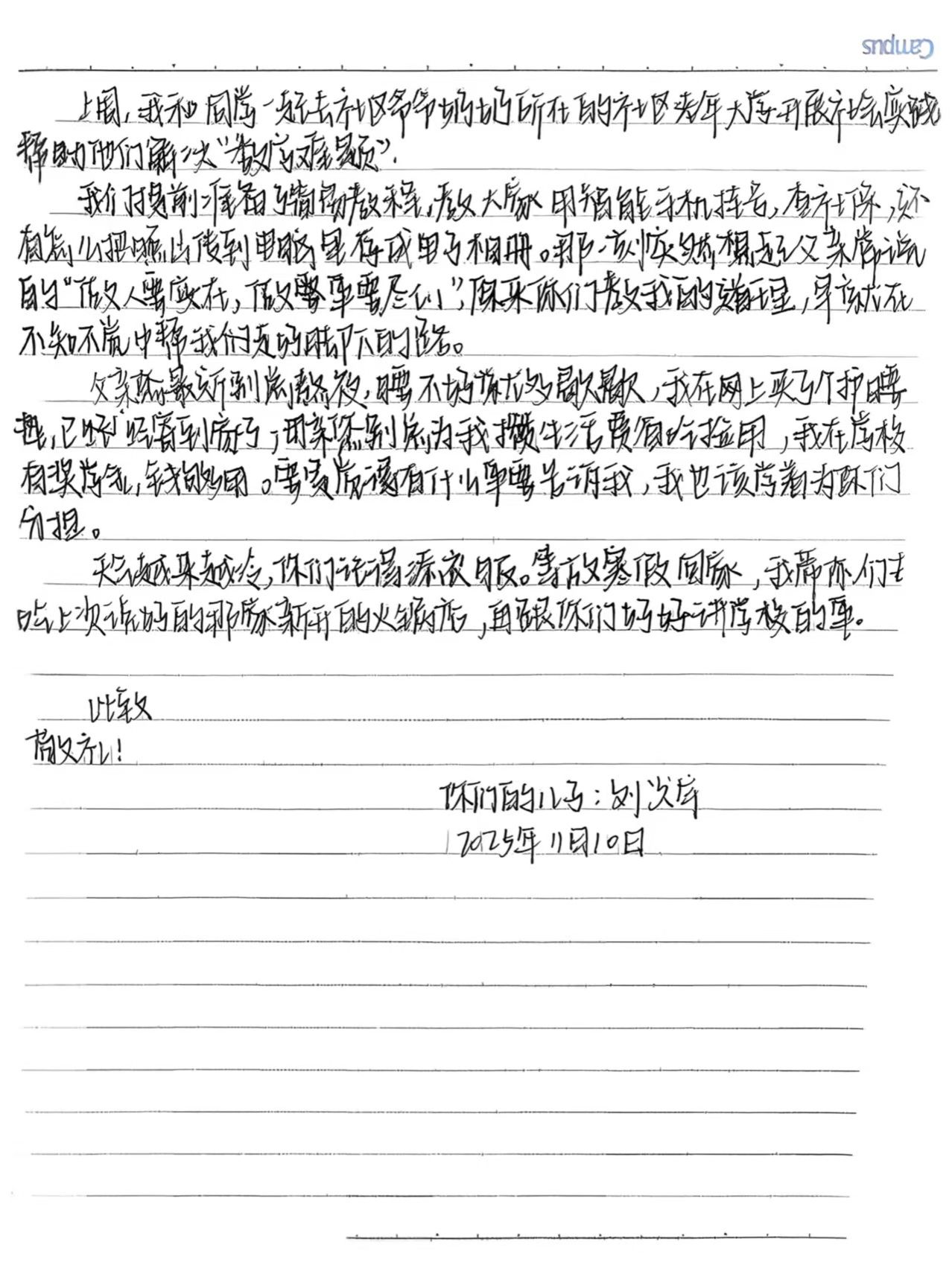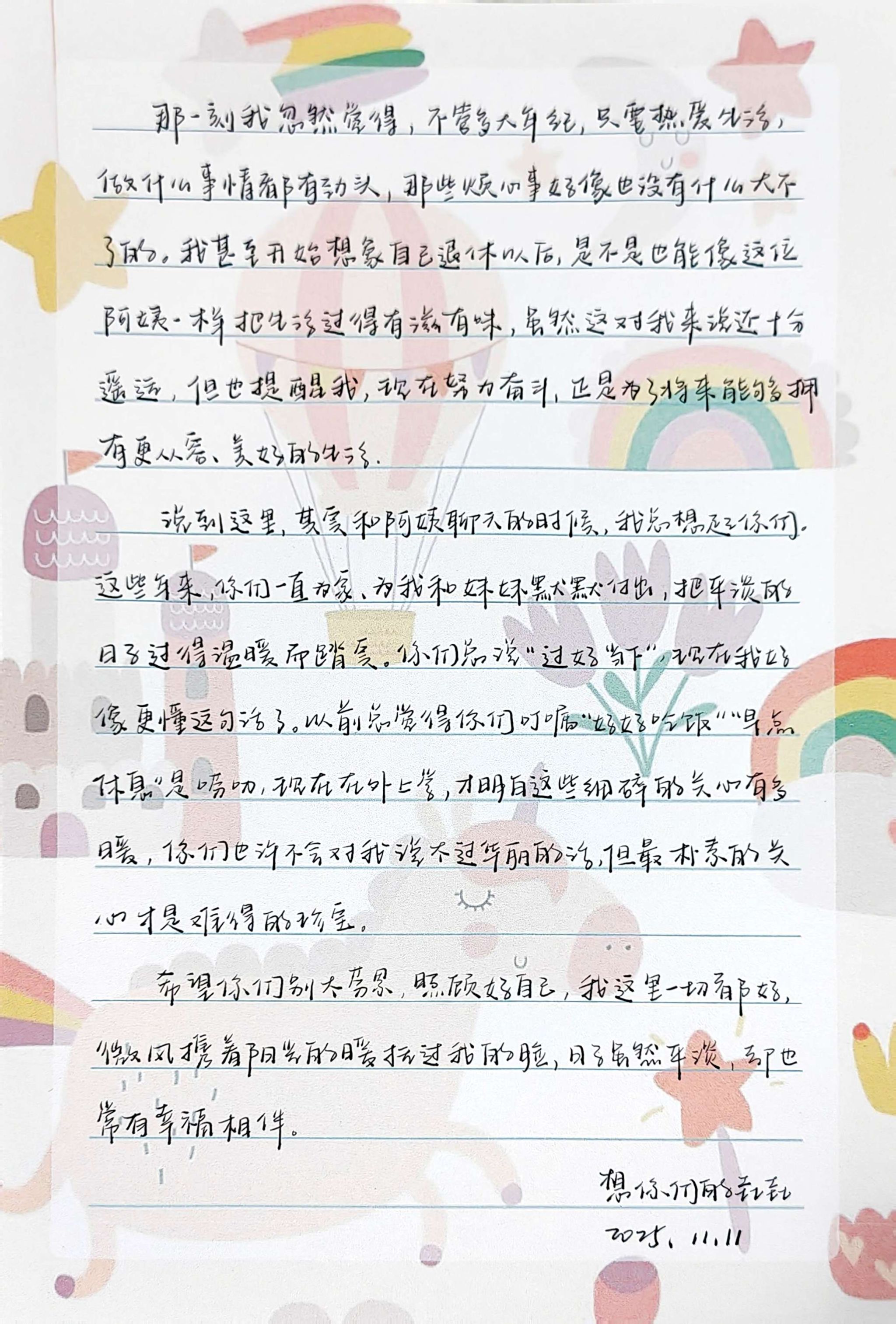 短短一个半小时,对老人而言,收获的是被倾听的温暖和解决难题的安心;对学生来说,得到的是与长辈交流的感动,以及用所学帮助他人的成就感。这份双向的温暖,成了课堂最珍贵的收尾。“给父母的一封信”是此次社会实践课的课后作业,学子们将课堂中从老人身上体会到的父母之心,化作纸上的涓涓细流。这封家书,是“文心秀行”社会实践课的“应有之义”。