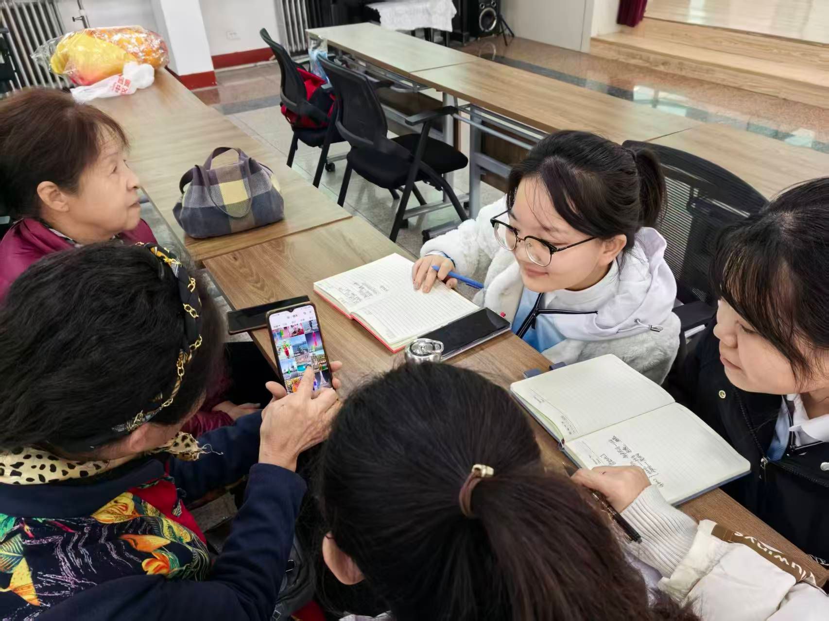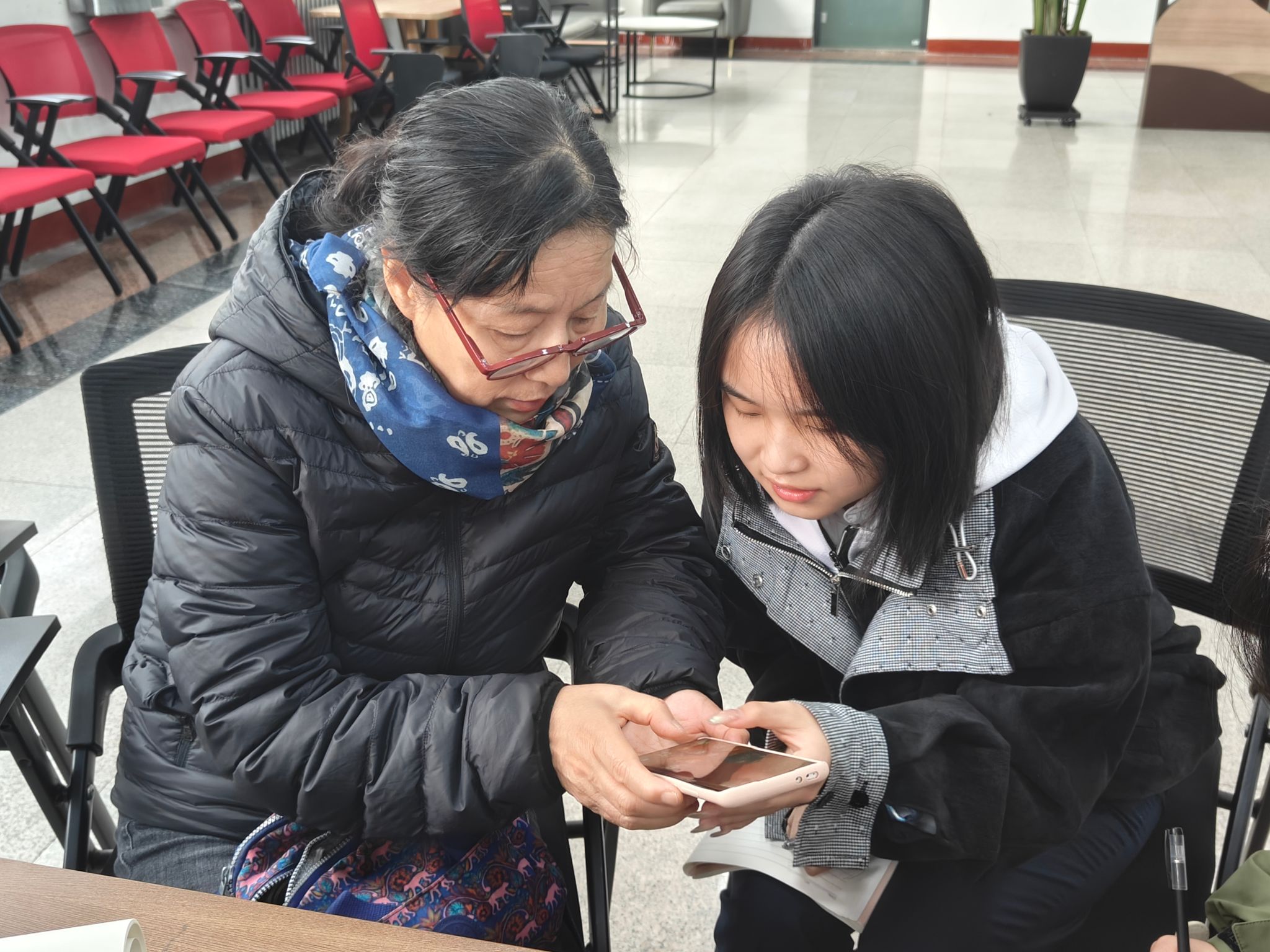在深度倾听的基础上,学子们通过“青春助力:‘您来提问 我来解答’”环节,纷纷化身耐心的“数字桥梁工程师”,以志愿服务精准对接银龄群体数字需求——从清理手机内存、识别诈骗广告,到线上挂号、扫码支付、视频剪辑,学生们开展一对一、手把手的沉浸式教学。“文秀2班”学生一边熟练地操作手机,帮老人调整微信字体大小、置顶聊天框,一边笑着说“您有任何手机操作问题,或者想聊聊天,随时发消息就行”,社团杜阿姨攥着手机,反复确认“这是太好了”,眼里满是安心。