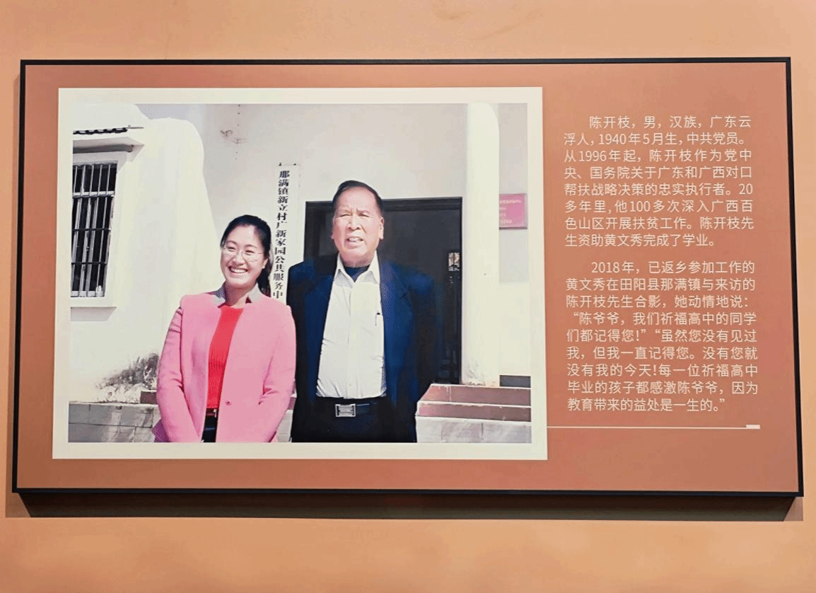 2022年6月,学校策划建设谱写新时代的青春之歌——杰出校友黄文秀先进事迹展,展览开篇单元“大山女儿 向阳而生”中,陈开枝与黄文秀这段跨越代际的“80后”助学“80后”的感人故事,成为展馆最打动人心的育人元素。