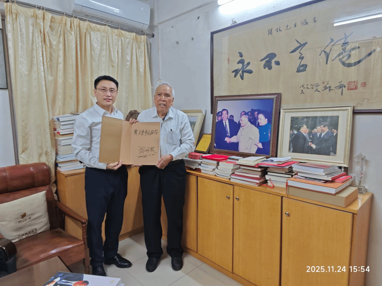 南粤初冬,暖阳如煦。11月24日,我校党委书记曹景川携全校师生深情厚谊,专程前往广东省老区建设促进会,拜访我校杰出校友黄文秀的资助人、中国扶贫基金会副会长陈开枝先生。这位被誉为“全国扶贫状元”的八旬老人,用三十载春秋书写了“先富帮后富”的时代答卷。曹景川代表全校向陈开枝致以崇高敬意,双方就深化“文心秀行”思政品牌进行深入交流,共绘育人新蓝图。